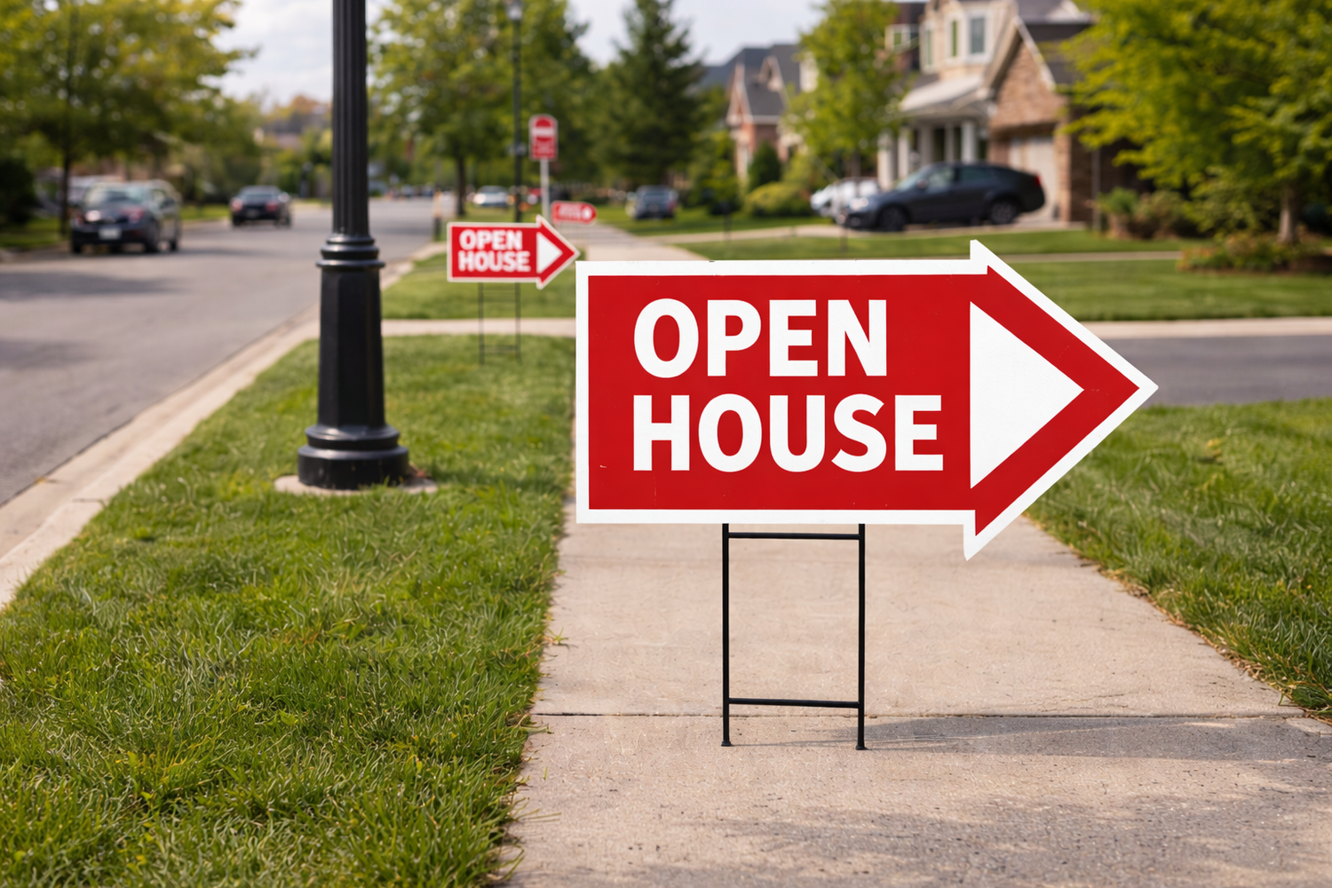 Signs are placed strategically for visibility before the open house and removed afterward.